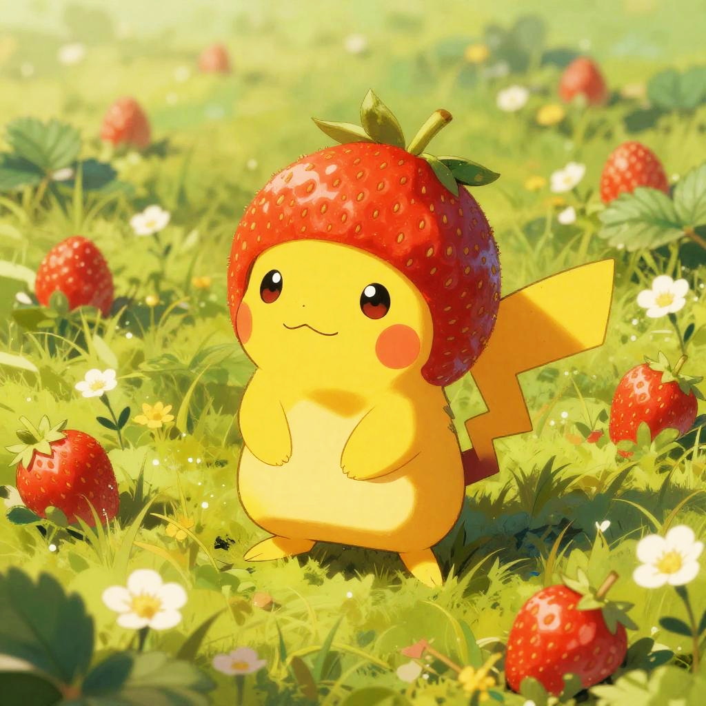 Strawberry Pokemon, imaginative fusion of strawberry fruit and small mythical creature, playful expression, vibrant fields of wild strawberries, digital painting style