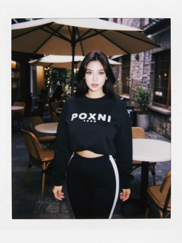 A svelte woman in a casual sporty outfit, wearing a black crew neck sweatshirt with white lettering and matching black track pants with white side stripes, stands in a cozy cafe with umbrellas in a quaint alleyway, captured in the style of a polaroid instant camera. Sexy. Pretty face and beаutiful eyes. Big breasts