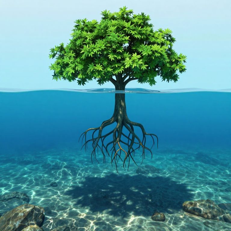 A surreal 3D-rendered scene depicts a solitary tree growing upside-down from the ocean's surface, its vibrant green canopy rooted firmly in the clear blue water, while its intricate root system extends skyward, creating a mesmerizing aquatic shadow dance on the rocky seabed below.