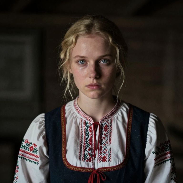 Photograph of a young Caucasian woman with fair skin, blue eyes, and blonde hair pulled back. She wears a traditional white blouse with red and black embroidered patterns on the collar and sleeves, and a black vest with red trim. Her expression is serious and slightly somber. The background is dark and blurred, suggesting an indoor, possibly rustic setting. The lighting highlights her face, creating a dramatic contrast with the shadowy background. The overall mood is intense and mysterious.