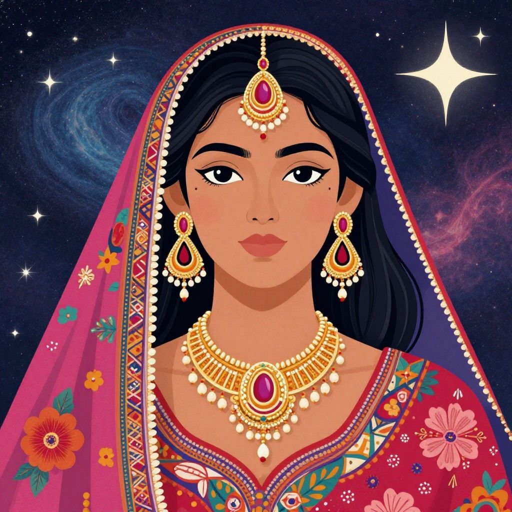 Digital illustration of a South Asian woman with medium brown skin, dark straight hair, and large brown eyes. She wears a red floral saree with gold and pink embroidery, a matching headscarf, and elaborate traditional jewelry including a gold necklace with a large red gem, matching earrings, and a forehead piece. Her makeup includes subtle eyeliner and pink lipstick. The background is a starry night sky with swirling nebula clouds. The woman's expression is calm and confident, and her attire and accessories are vibrant and ornate.