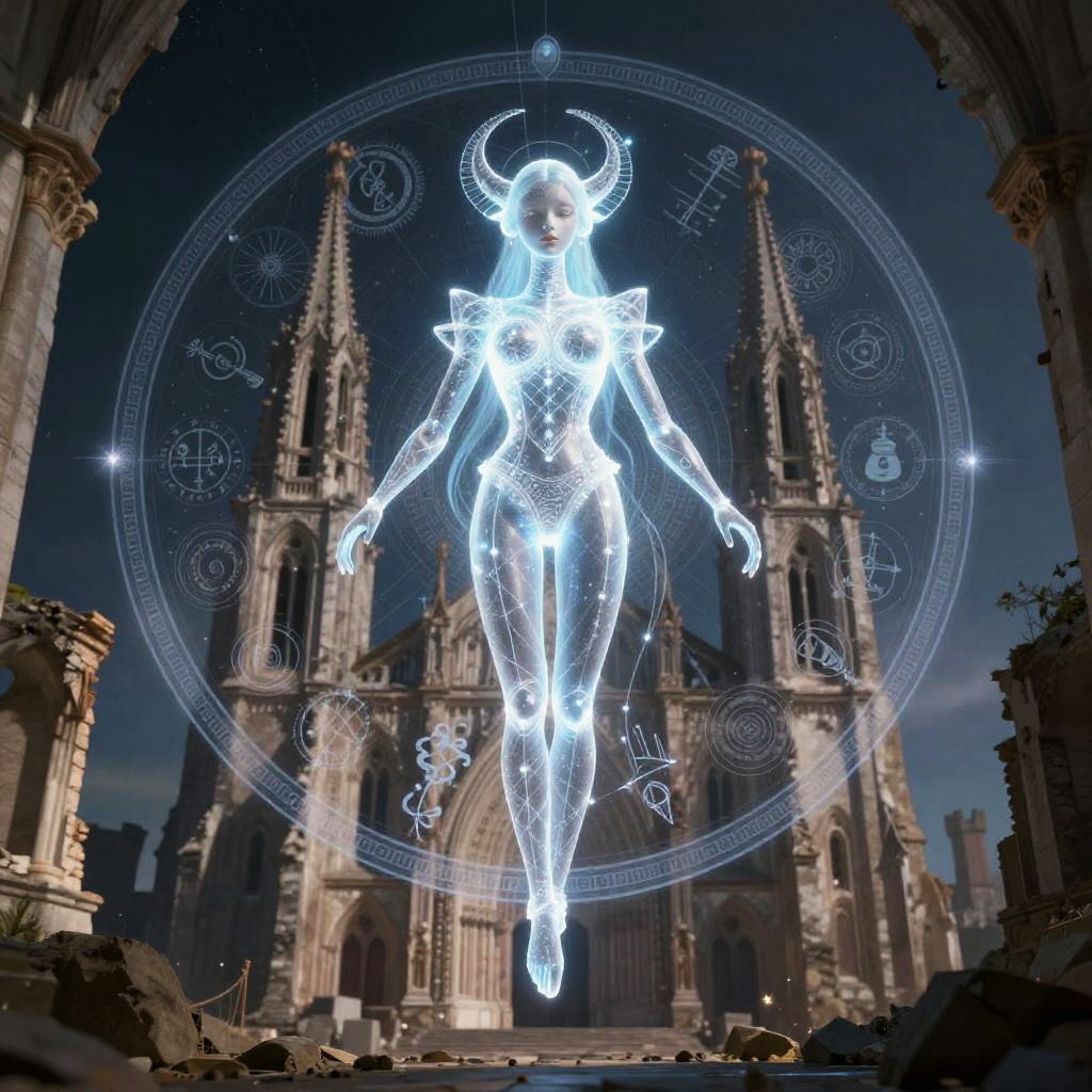 A astral marionette featuring an phosphorescent guardian set against a backdrop of ruined cathedral suspended in orbit. Surrounded by intricate patterns and ancient symbols, this scene conveys a sense of wonder, beautifully illuminated to highlight its flawless features.