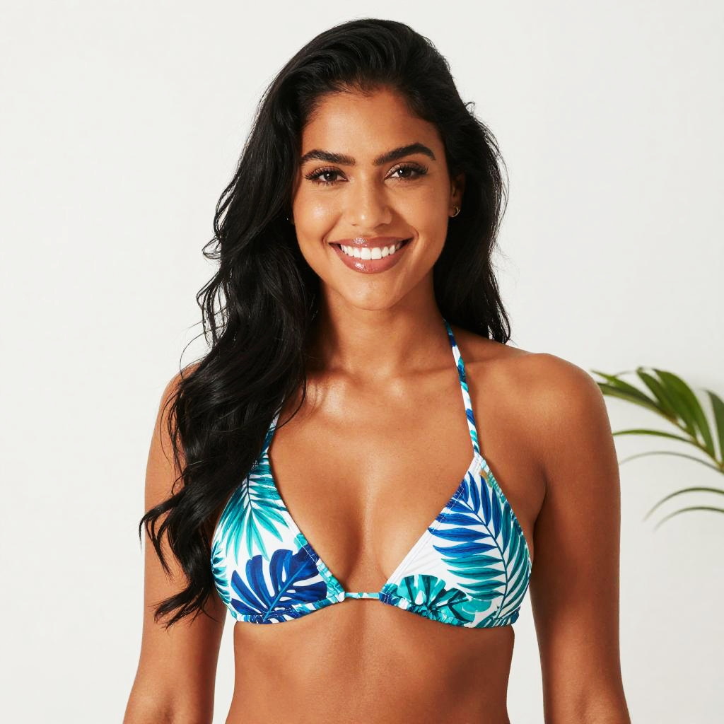 Photograph of a smiling woman with long, wavy black hair wearing a blue and white tropical leaf print bikini top. She has tanned skin, dark eyes, and full, glossy lips. The background is plain white with a small green plant on the right. She exudes a confident and happy vibe, standing directly facing the camera.