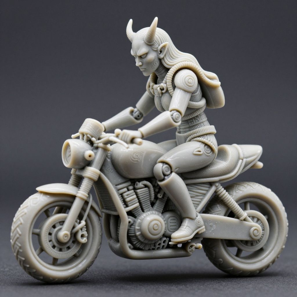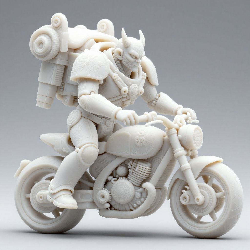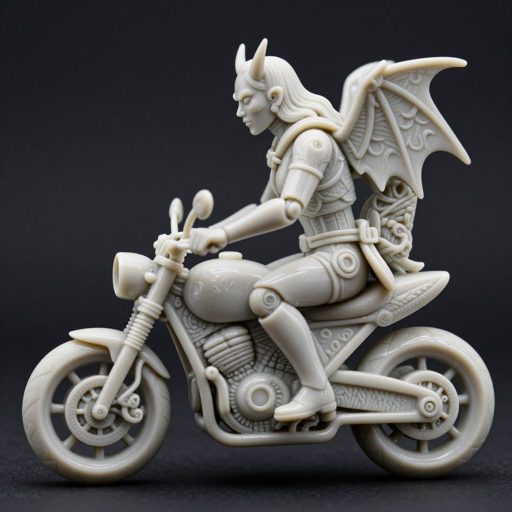 White 3D sculpted bat-winged figure riding a detailed motorcycle, side profile, against a black background, intricate armor and wing textures.