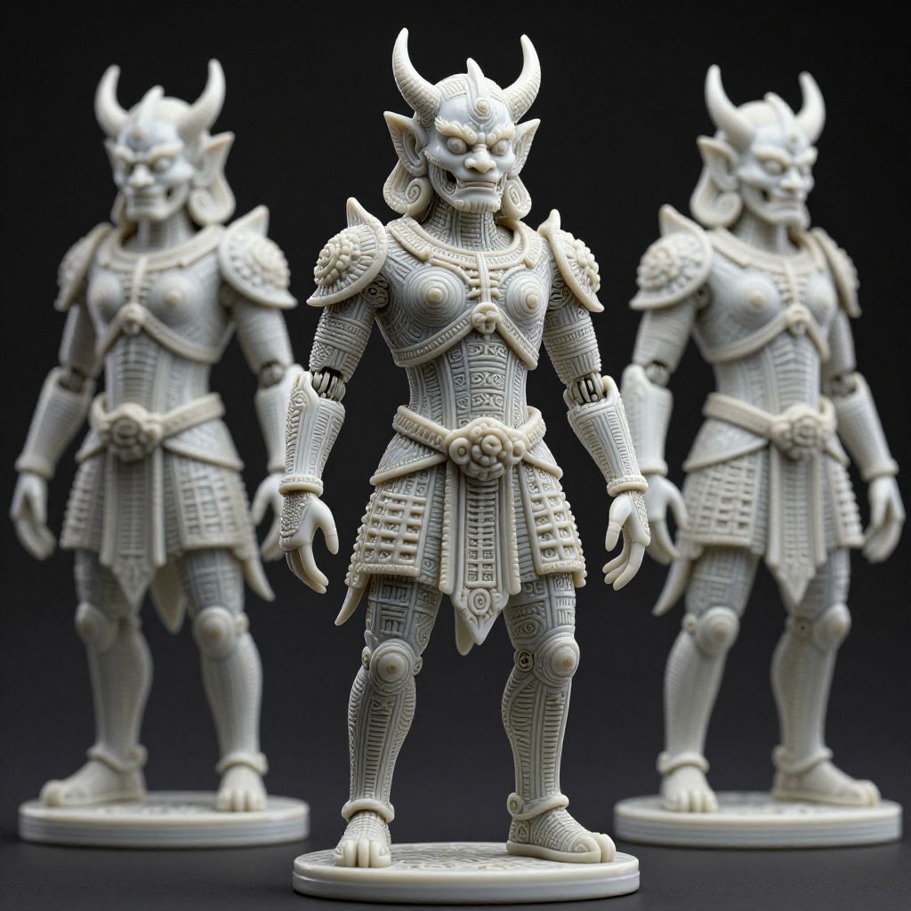 Carved porcelain cyborg demons riding a motorcycle different full body modelposition, high detailed cinematic background, Miki Asai Macro photography, close-up, hyper detailed, trending on artstation, sharp focus, studio photo, intricate details