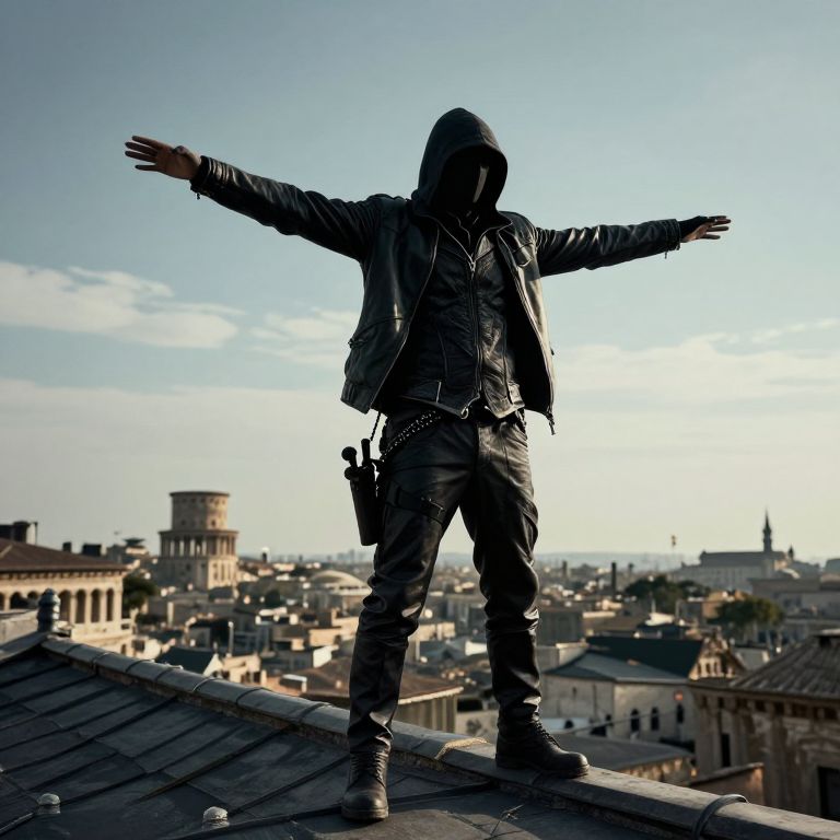 Perched atop a rooftop, the assassin's outstretched arms embrace the freedom of the open sky, symbolizing a paradoxical blend of solitude and boundless possibility, as the ancient city below whispers tales of history and mystery.