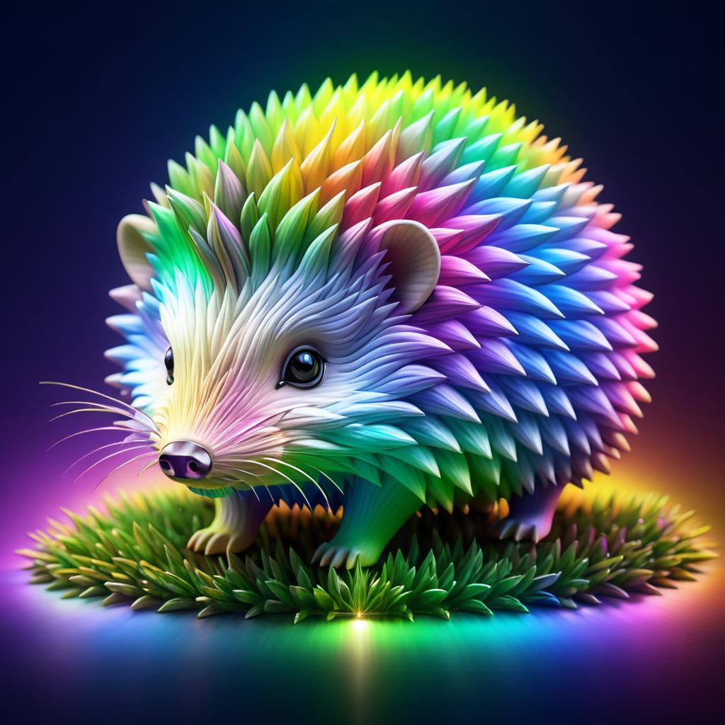 Ultra-realistic painting of a charming hedgehog with intricate details, volumetric rainbow lighting, and symmetry, rendered in Unreal.