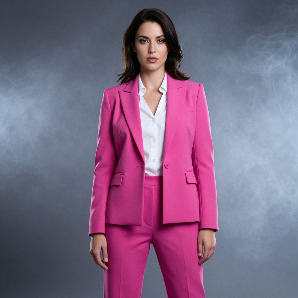 Photograph of a confident woman with long black hair, wearing a sharp white suit, white heels, and a gold button, standing in a sunny parking