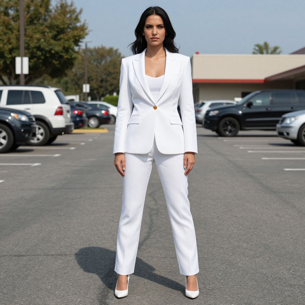 Photograph of a confident woman standing in a parking lot. She has long, straight black hair and wears a sharp, white, double-breasted blazer with a deep V-neck, paired with white trousers and white high-heeled shoes. Her skin tone is medium olive, and she has a serious expression. The background features several parked cars, including black and white SUVs, and a beige building with a red trim. Trees and a clear blue sky are visible in the distance. The parking lot has asphalt with white parking lines. The woman's attire and stance exude professionalism and strength.