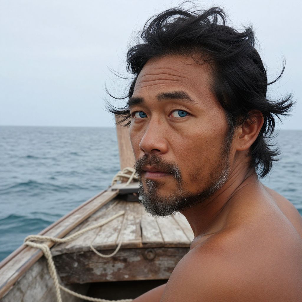 Compose an iPhone portrait of a charismatic East Asian man with weathered skin and piercing blue eyes, his visage etched by years sailing the open seas. Perched atop a rugged wooden boat in a serene coastal setting, he sports a salt-and-pepper beard ruffled by the salty breeze, adding to his enigmatic expression fixed on the distant horizon. This perspective showcases both the ocean's vastness and his intimate connection with nature.