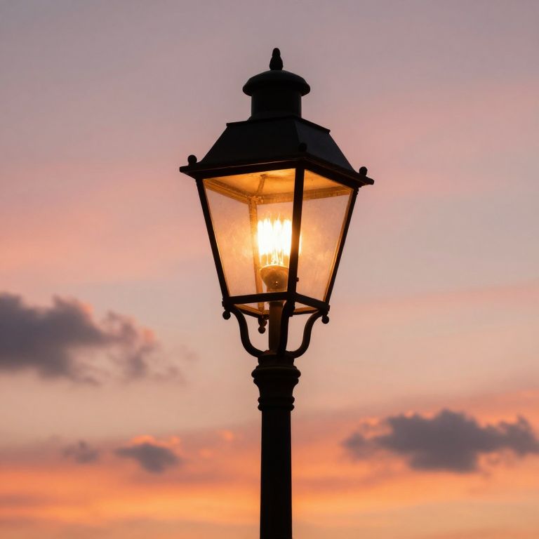 A photograph of a vintage-style street lamp with a glowing bulb, set against a dramatic sunset sky. The lamp's black frame and ornate finial are silhouetted, with the sun's warm light peeking through the glass. The sky is painted in soft hues of pink and orange, with scattered clouds adding texture. The image has a cinematic, atmospheric vibe.