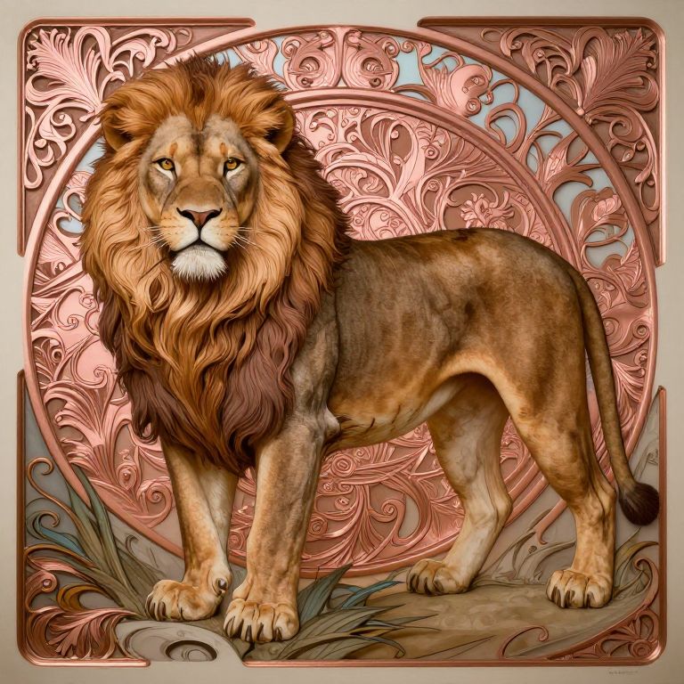 A highly detailed, ornate, and symmetrical matte painting of an armored lioness, featuring intricate rose gold lighting and a cinematic style reminiscent of Ernst Haeckel, Charles Audubon, and Alphonse Mucha.
