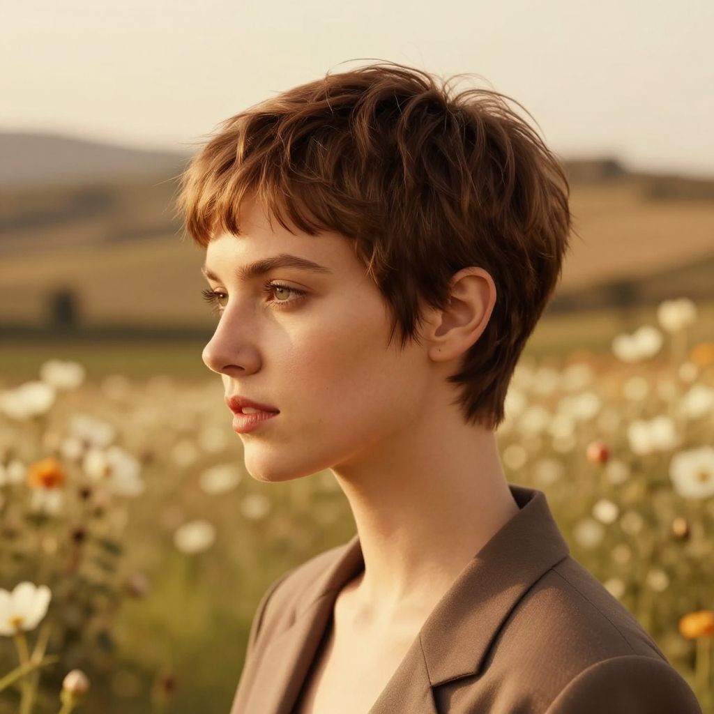 Vintage-inspired Italian pixie haircut, short textured crop with subtle highlights, set against an Italian countryside backdrop with blooming flowers and warm tones, cinematic style.