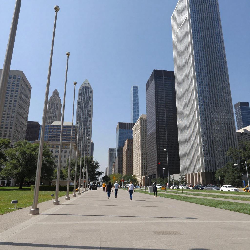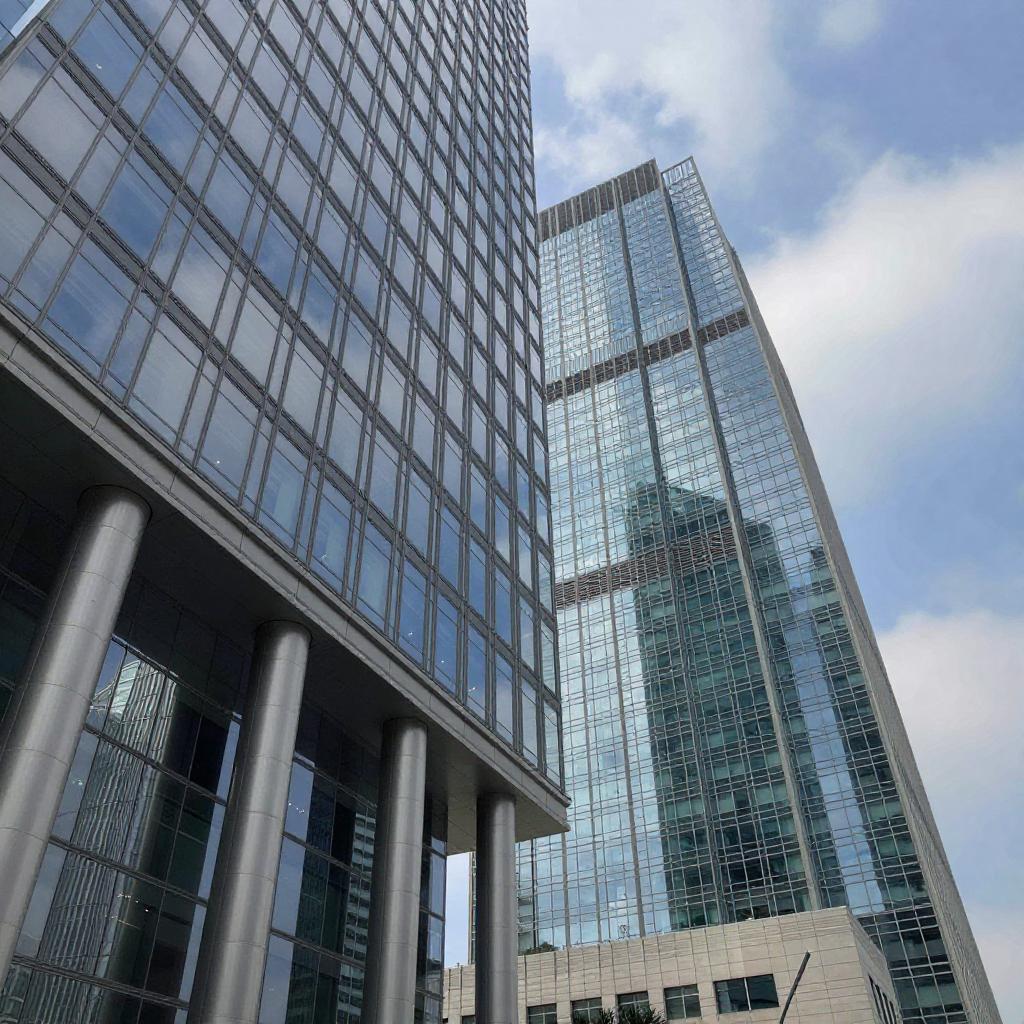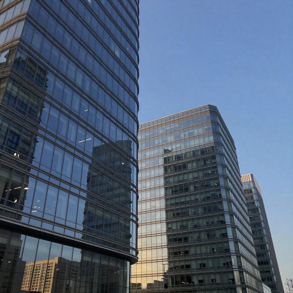This is a high-angle, slightly tilted photograph of a bustling cityscape featuring tall skyscrapers with reflective glass facades. The lighting is bright, with sunlight casting sharp shadows. The foreground buildings are in sharp focus, while the background is slightly blurred, creating a shallow depth of field. The sky is clear blue, and construction cranes are visible in the distance. The camera angle adds a dynamic perspective to the urban scene.