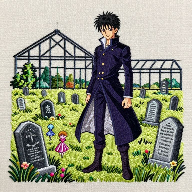 Embroidery Stitch Guide Full body character landscape,alien gravevard in a greenhouse, anime, berserk, a few fairy is staring at the grave,