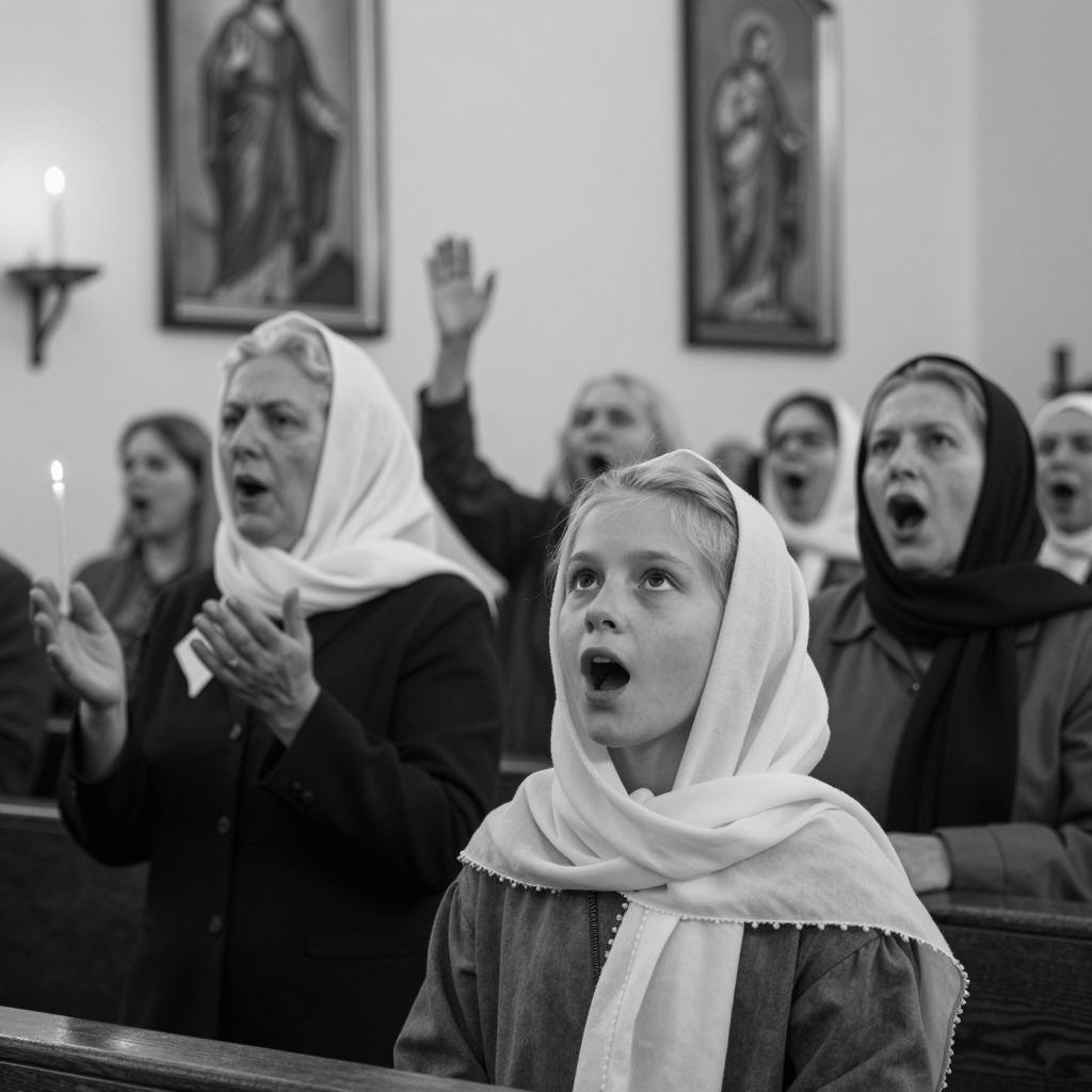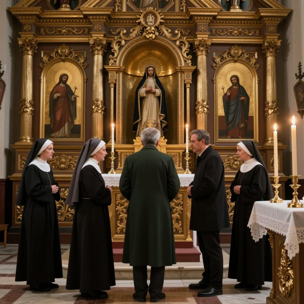 Church interior, dimly lit, ornate gold and brown decorations. Five nuns in black habits, two in gray and white veils. One man in green coat, back turned, standing in center. Another man in dark coat, holding a woman's arm. Candles on altar, right foreground. Religious icons in niches, background. Figures interact near altar, center.