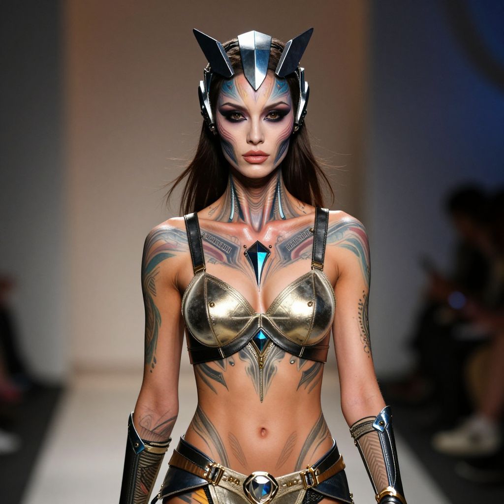 In this ultra-realistic real photo, a young woman with an alien cyborg appearance stands confidently on a fashion show stage, exuding an air of elegance and mystery. Her detailed face and body are adorned with intricate designs, featuring a symmetrical, vibrant, and highly detailed face with tattoos on her torso and upper belly. She wears a striking headpiece with geometric shapes and a metallic finish, complementing her futuristic attire. The clothing is a blend of metallic and fabric elements, with a central emblem that adds to the sci-fi aesthetic. The background is a soft, blurred mix of warm and cool tones, creating a dramatic contrast that highlights the subject. The overall composition is masterfully crafted, with a focus on the woman's detailed features and the interplay of light and shadow, evoking a sense of depth and realism. The image is a testament to the power of photorealism, with elements like the 8k resolution, symmetric composition, and the use of HDR and volumetric lighting techniques, creating an epic and immersive visual experience.