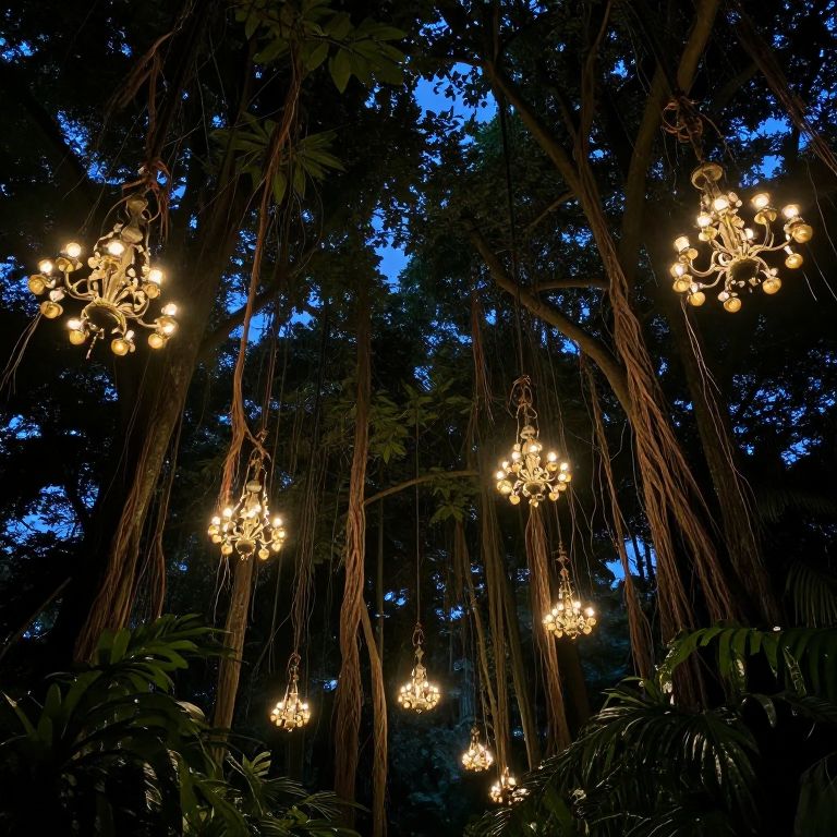 Photograph of a nighttime forest scene featuring seven golden chandeliers hanging from tall tree branches. The chandeliers, with their warm, glowing bulbs, contrast against the dark, dense foliage and the deep blue twilight sky. The tall trees have thin, brown trunks and lush green leaves, creating a natural canopy. The chandeliers are evenly spaced, with some higher than others, and their light casts a soft, inviting glow on the surrounding leaves and branches. The overall composition blends the elegance of the chandeliers with the wild, natural beauty of the forest.