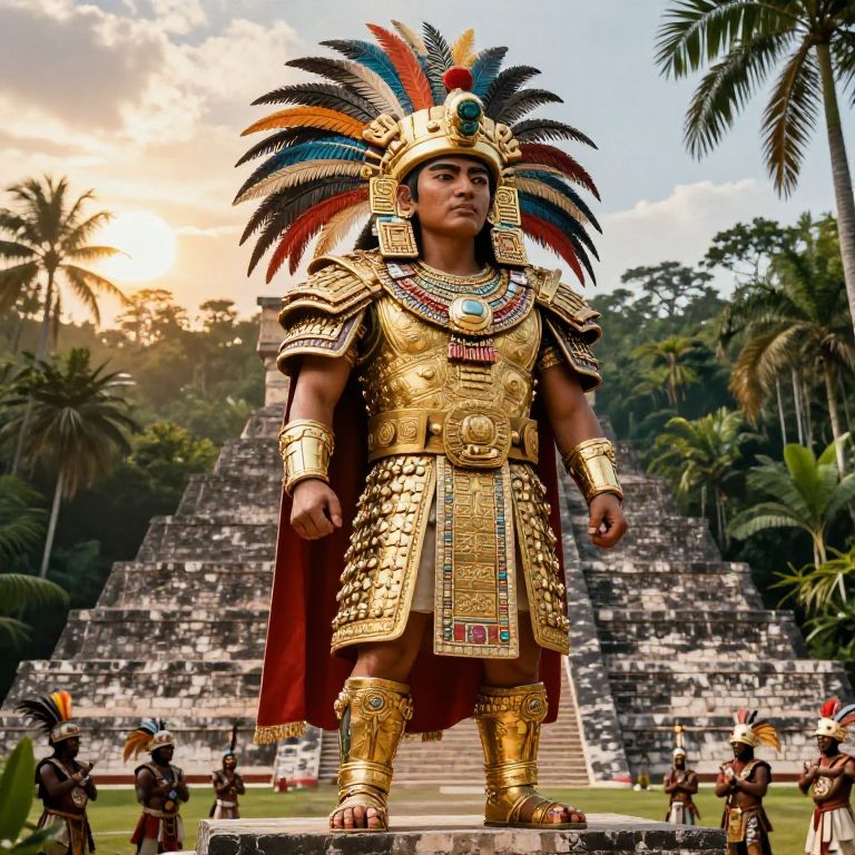 Moctezuma, ancient Aztec emperor clad in intricately detailed golden armor, standing majestically atop a grand pyramid during sunrise, vibrant feathers and traditional jewelry shining, surrounded by lush tropical jungle and ceremonial warriors, hyper-realistic style.