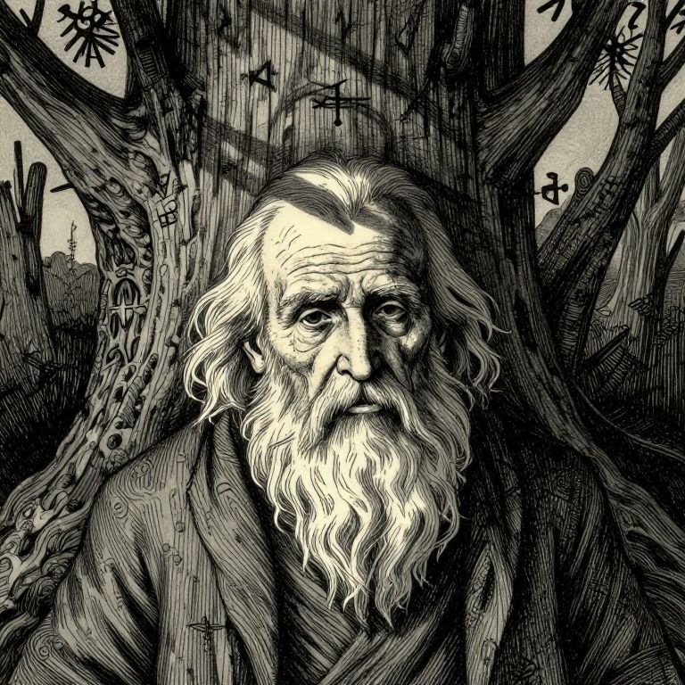Ludvig, a serene portrait of a wise old scholar with a long white beard in a cozy ancient library, warm golden light filtering through stained glass windows, oil painting style, highly detailed and expressive