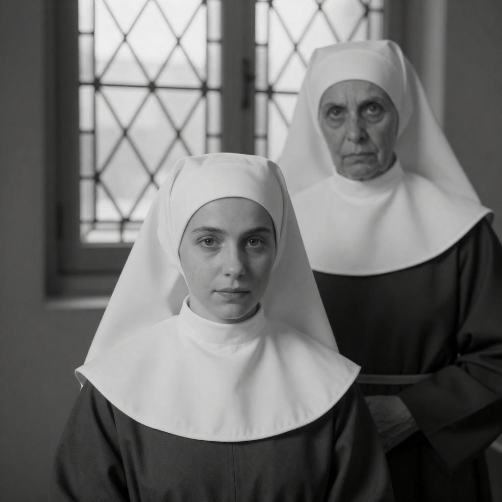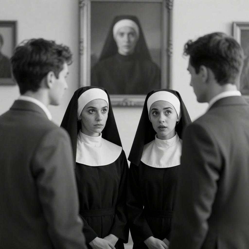 Black-and-white photograph of a nude woman with long dark hair facing three men in religious attire. Men wear black robes and hats, one with a white clerical collar. Large cross on wall behind them. Woman's back to camera, men facing her. One man on right has a stern expression. One man in center holds a candle. Curly-haired woman in middle has neutral expression. Three men on right, one slightly behind. Table in front of men. Intense expressions on men's faces.