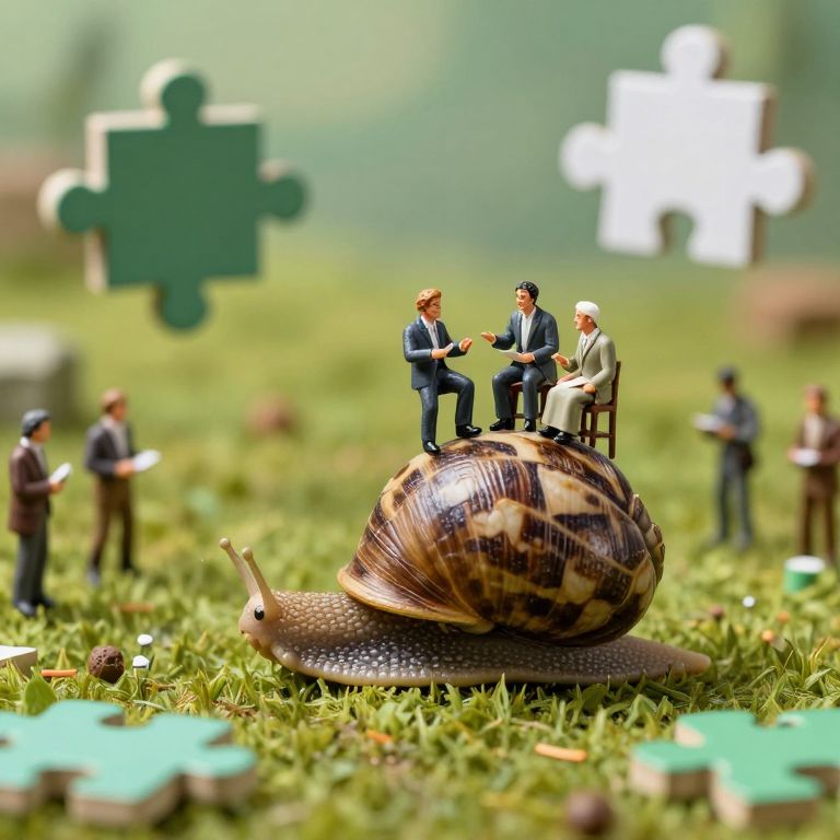 An army of miniature philosophers debate ethics atop the back of a snail marching through a field of floating logic puzzles.