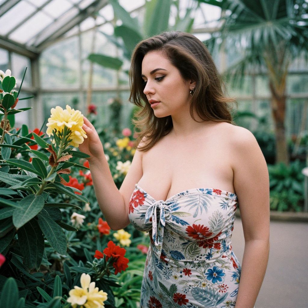 A stocky woman in a casual spring strapless dress with a floral pattern in red and blue, stands in a botanical garden by the tropical greenhouse, admiring the vibrant flowers around her. The scene is captured in a chromogenic film style, highlighting the lush greenery and colorful blooms as she gently touches a flower, lost in the beauty of nature. Sexy. Pretty face and beаutiful eyes. Big breasts
