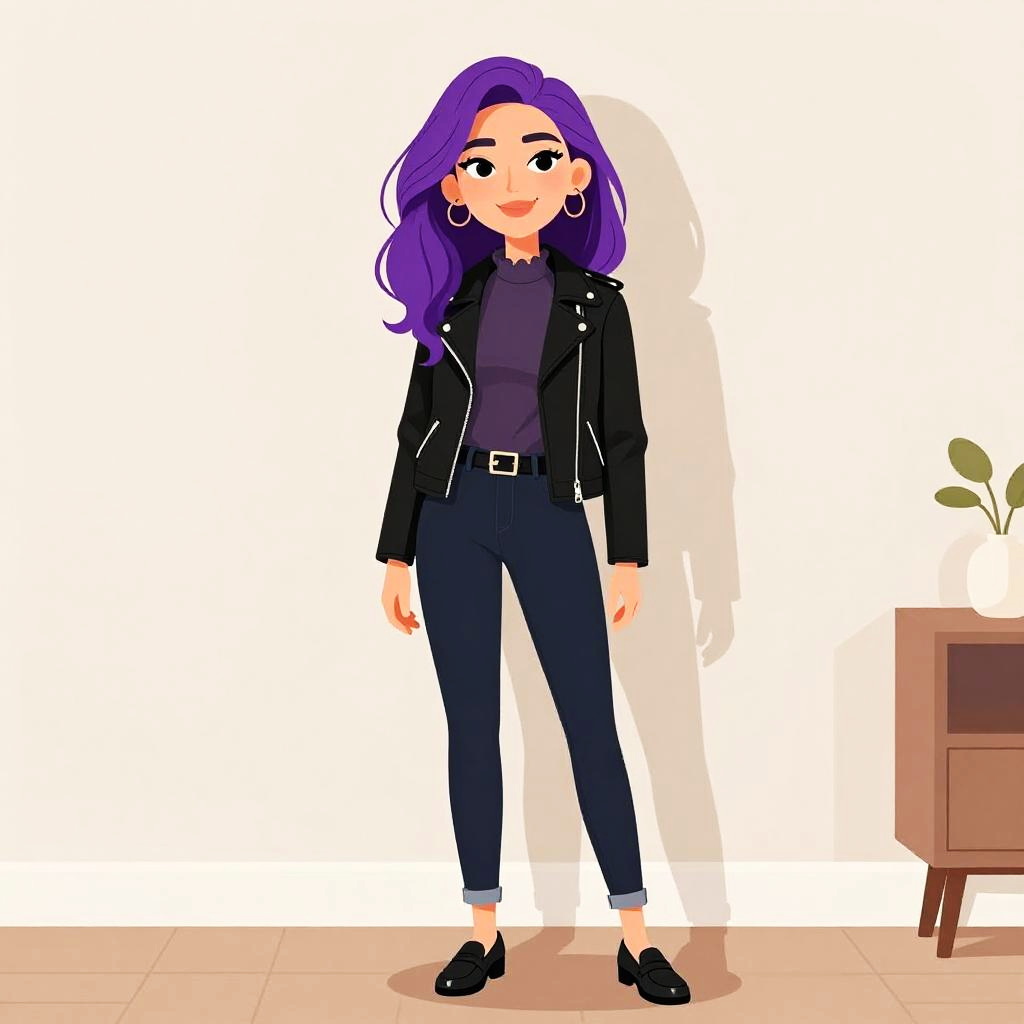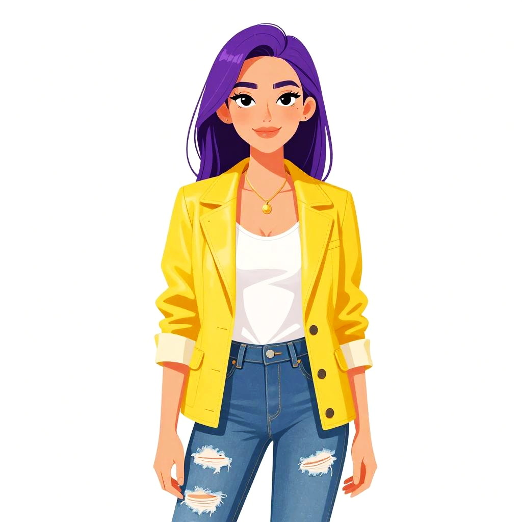 This digital drawing in a cartoon style features a confident woman with straight, shoulder-length purple hair and fair skin. She wears a bright yellow, fitted leather jacket with black zippers over a light blue t-shirt, paired with black, high-waisted, cropped pants and black flats. She stands with a slight smile, her hands relaxed by her sides. The background is plain white, emphasizing her colorful outfit. The art style uses bold, clean lines and vibrant colors, with minimal shading, giving it a modern, playful look.