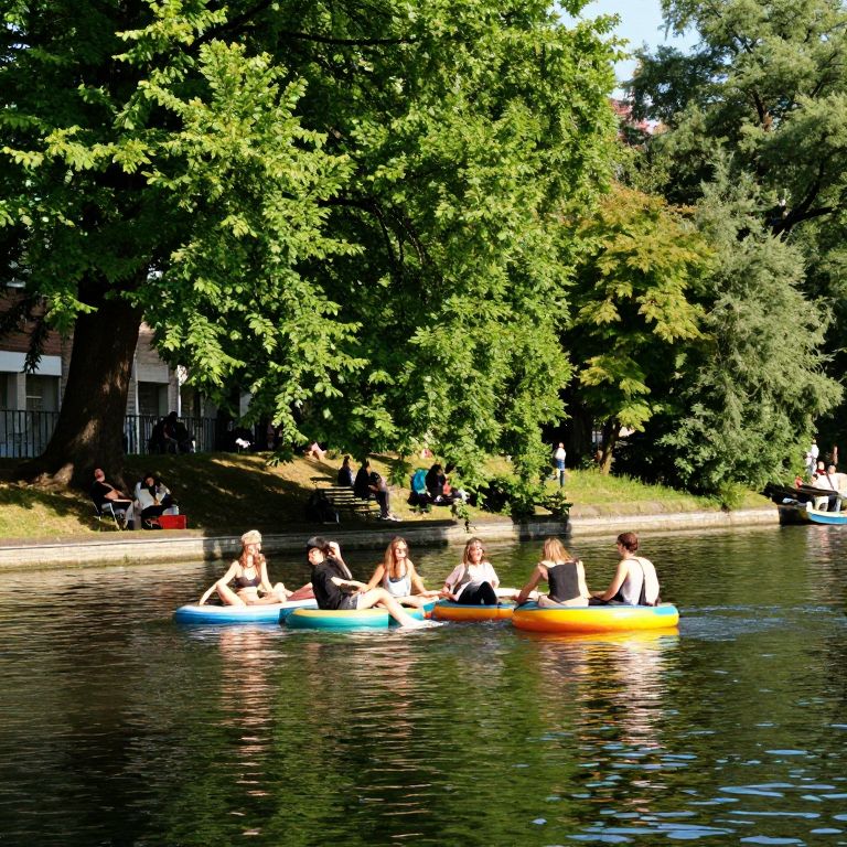 Amidst the gentle ripple of the Landwehrkanal, vibrant laughter and the warmth of sunlight intertwine, offering a fleeting escape into the embrace of freedom and renewal, as people find solace and joy in the simple act of floating together under the watchful canopy of green.