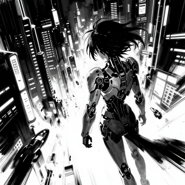 Black and white anime art of a futuristic cityscape with a lone female protagonist wearing cybernetic armor, bold brush strokes with heavy use of blacks and whites creating stark contrast, dynamic perspective with flying vehicles and neon signs rendered in monochrome, intricate details in buildings.
