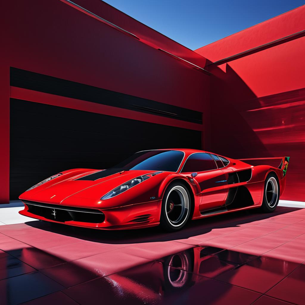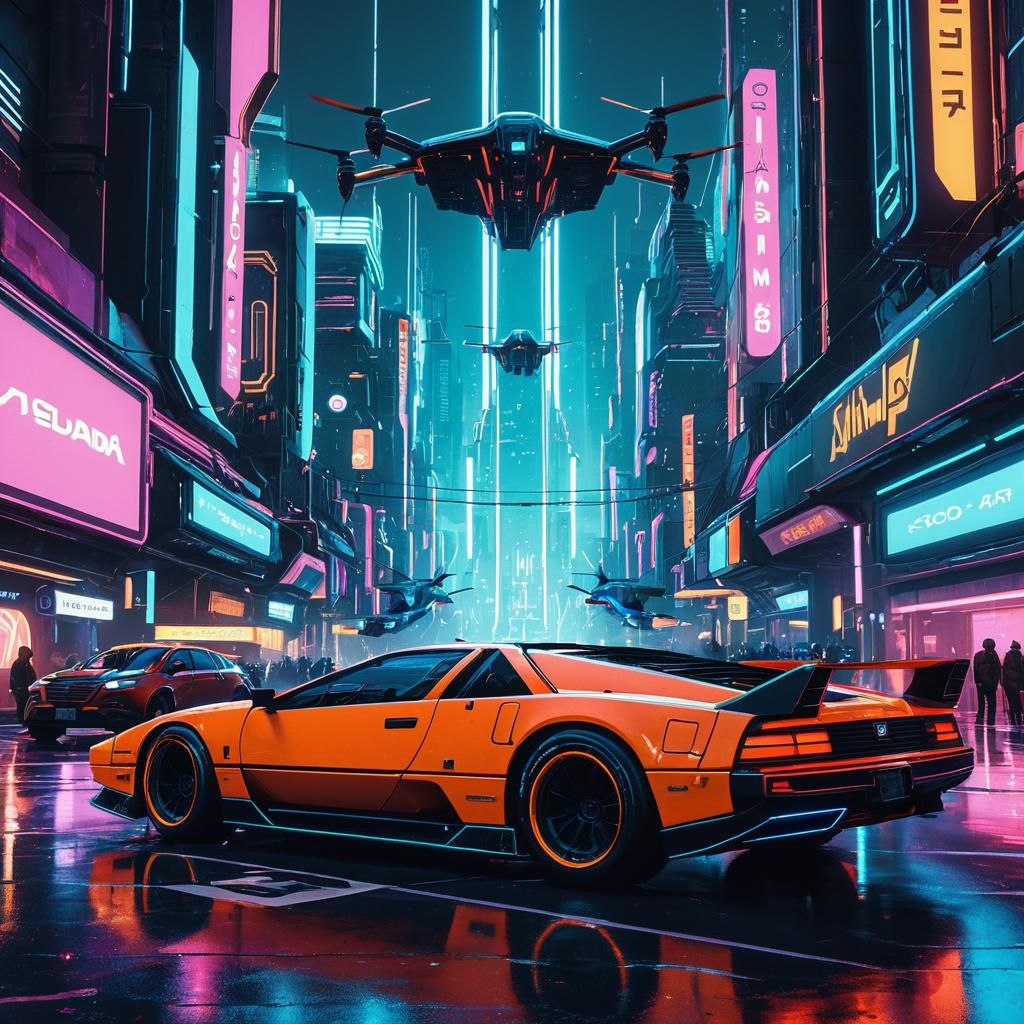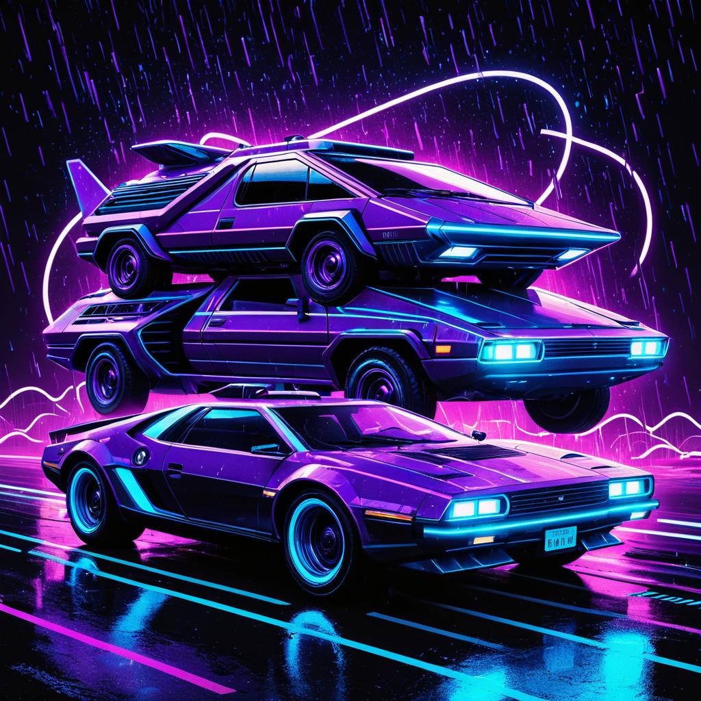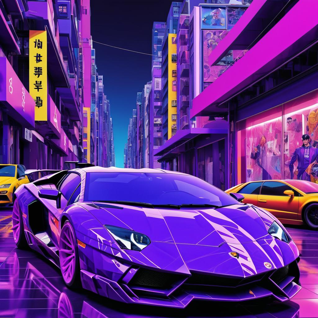 A bold purple Lamborghini sports car parked on a colorful street with buildings painted in bright shades of pink, orange, green, and purple. The scene is stylized with vibrant comic cover art influences, featuring clean lines, high contrast colors, and a surreal urban setting. No people are present in the image.