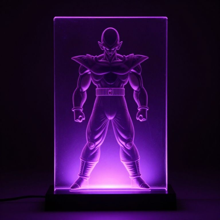 Emitting vibrant purple hues, the Dragon Ball Super Jiren Color Changing 3D Illusion Acrylic Lamp showcases a detailed silhouette of Jiren standing confidently within a rectangular acrylic panel, casting a mesmerizing glow against a dark background.