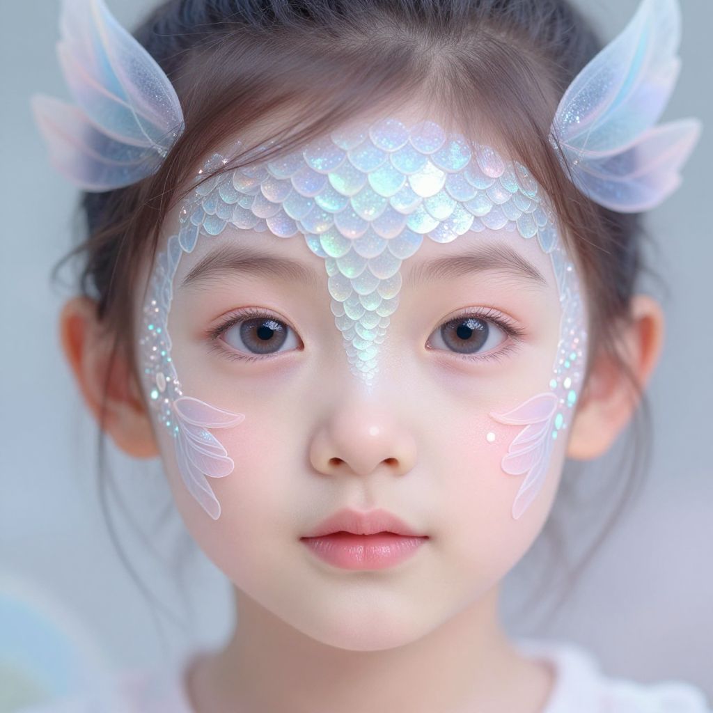 A photograph of an Asian young girl with fair skin and large, dark brown eyes. She has dark brown hair tied back, adorned with transparent, wing-like accessories. Her face is decorated with shimmering, silver sequin-like patterns covering her forehead, cheeks, and nose, giving a magical or ethereal effect. She wears a white top and gazes directly at the camera with a neutral expression. The background is softly blurred in light blue and white, keeping the focus on her face. The image has a soft, dreamy quality with a high-key lighting style.