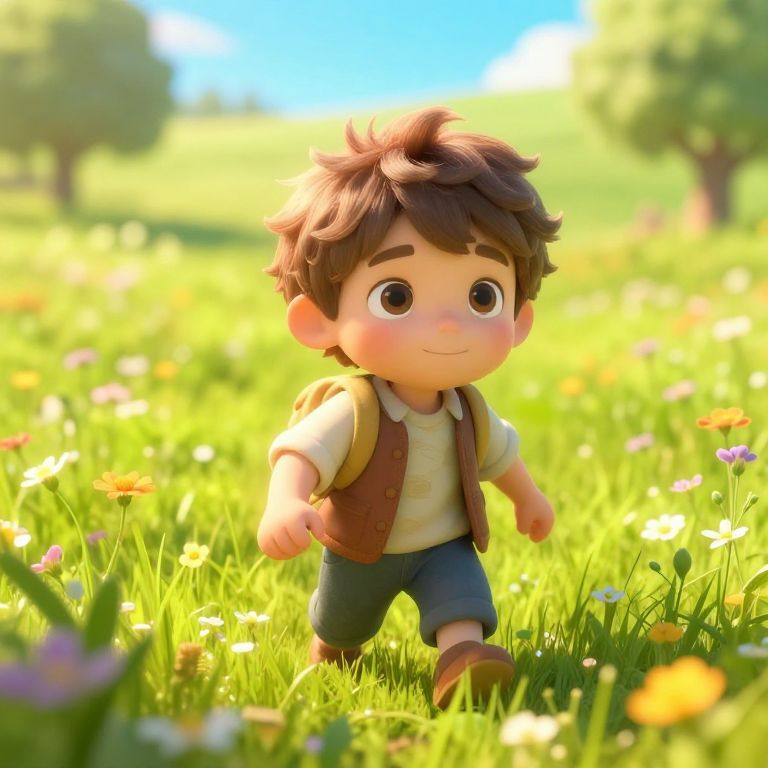 Photorealistic digital illustration of a cute, chubby-cheeked young boy with brown, tousled hair and large, expressive brown eyes. He is wearing a light yellow shirt, brown vest, blue pants, and brown shoes. He is walking through a vibrant, sunlit meadow filled with green grass and colorful wildflowers, including daisies and orange poppies. The background is blurred, featuring bright green trees and a clear blue sky. The boy's cheerful expression and casual attire suggest a playful, innocent moment in nature. The image is brightly lit, emphasizing the lush, sunny environment.