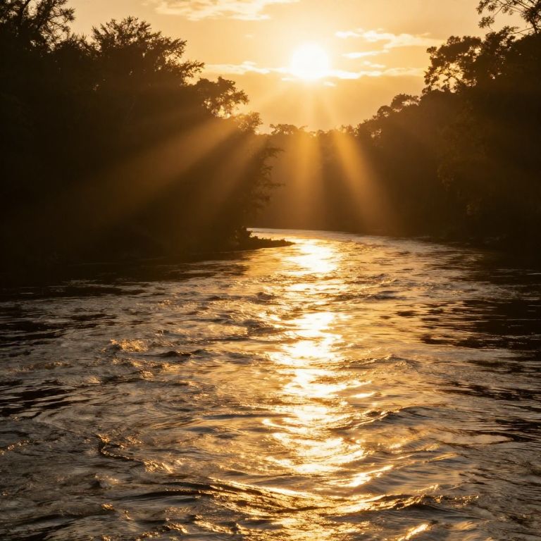 A serene view of a river with golden sunlight reflecting off its shimmering surface, surrounded by dark silhouettes of trees. The early morning sun casts radiant beams through the sky, creating a peaceful and timeless natural scene.