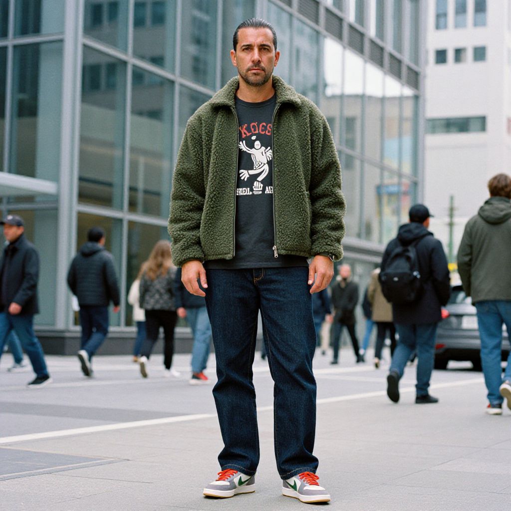 A man, olive green sherpa jacket, straight-leg dark blue jeans, graphic long-sleeve shirt, retro skate shoes, urban street style, modern glass facade, bustling city street, 3M ferrania analog film stock, confident expression. Man has masculine face and piercing eyes