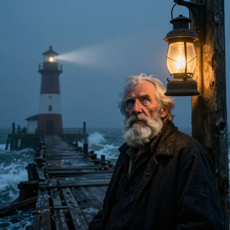Photograph of an elderly white man with a long white beard and grey hair, wearing a dark coat, standing beside a wooden post with a glowing lantern. He gazes into the distance at a misty, blue-hued night. In the background, a red and white lighthouse stands on a wooden pier with waves crashing against it. The lantern's warm light contrasts with the cool, misty blue sky, creating a dramatic, atmospheric scene. The man's weathered face and the lighthouse's steady light evoke a sense of solitude and resilience.