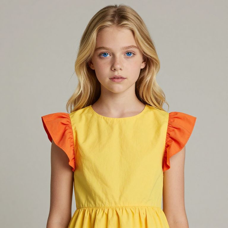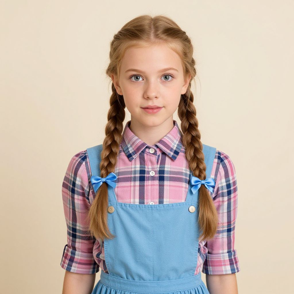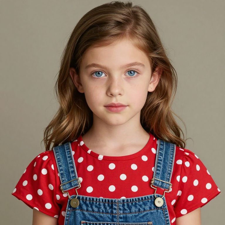 Girl with blonde hair, wearing a red and blue polka dot dress with a blue collar and a red bow in her hair.