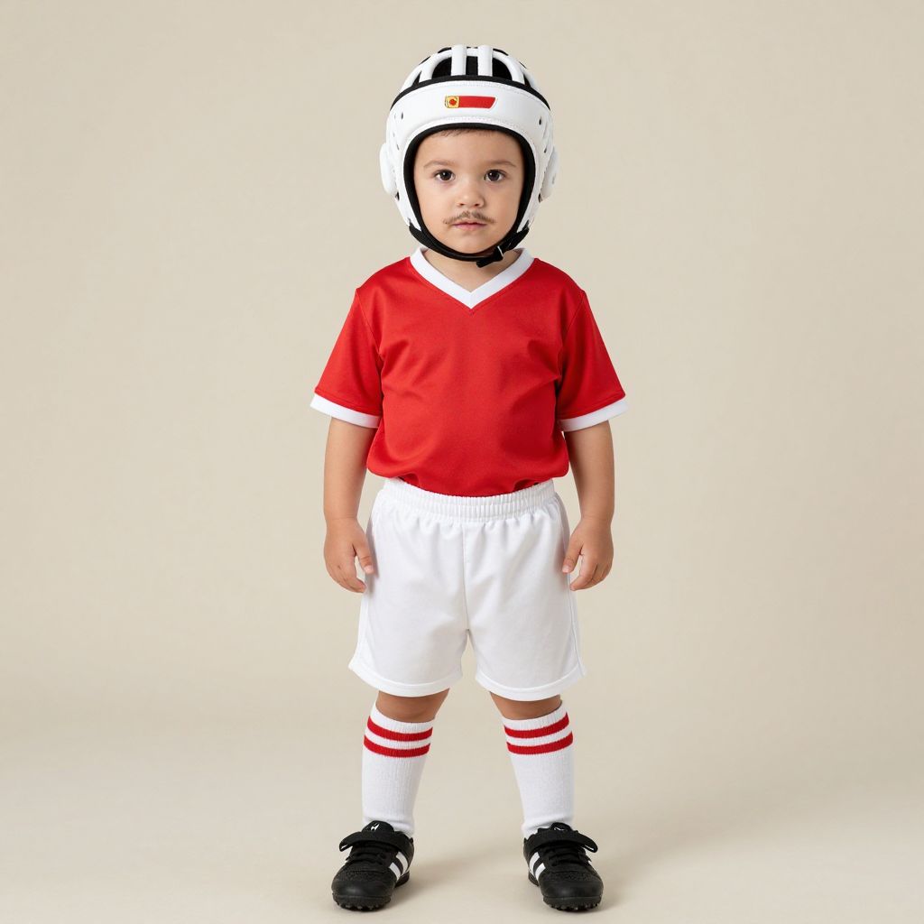 Infant football costume, 1boy, solo, male focus, sportswear, helmet, full body, facial hair, standing, soccer uniform, shoes, simple background, looking at viewer, pants, white pants, red shirt, mustache