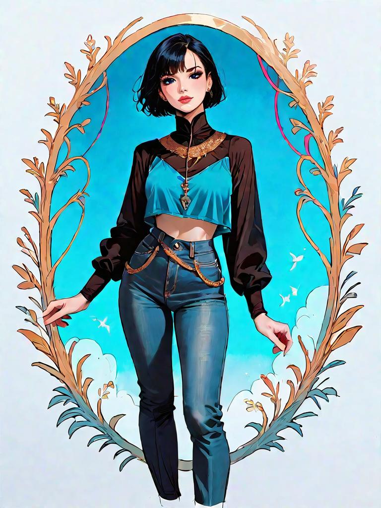 Digital illustration of a stylish young woman with short black hair, wearing a blue high-neck crop top with gold chain motifs and cut-out details at the chest and upper abdomen. She pairs the top with high-waisted slim jeans featuring chain accessories. The portrait features a full body shot against a vibrant blue background framed by decorative golden botanical elements, showcasing modern bold fashion style.