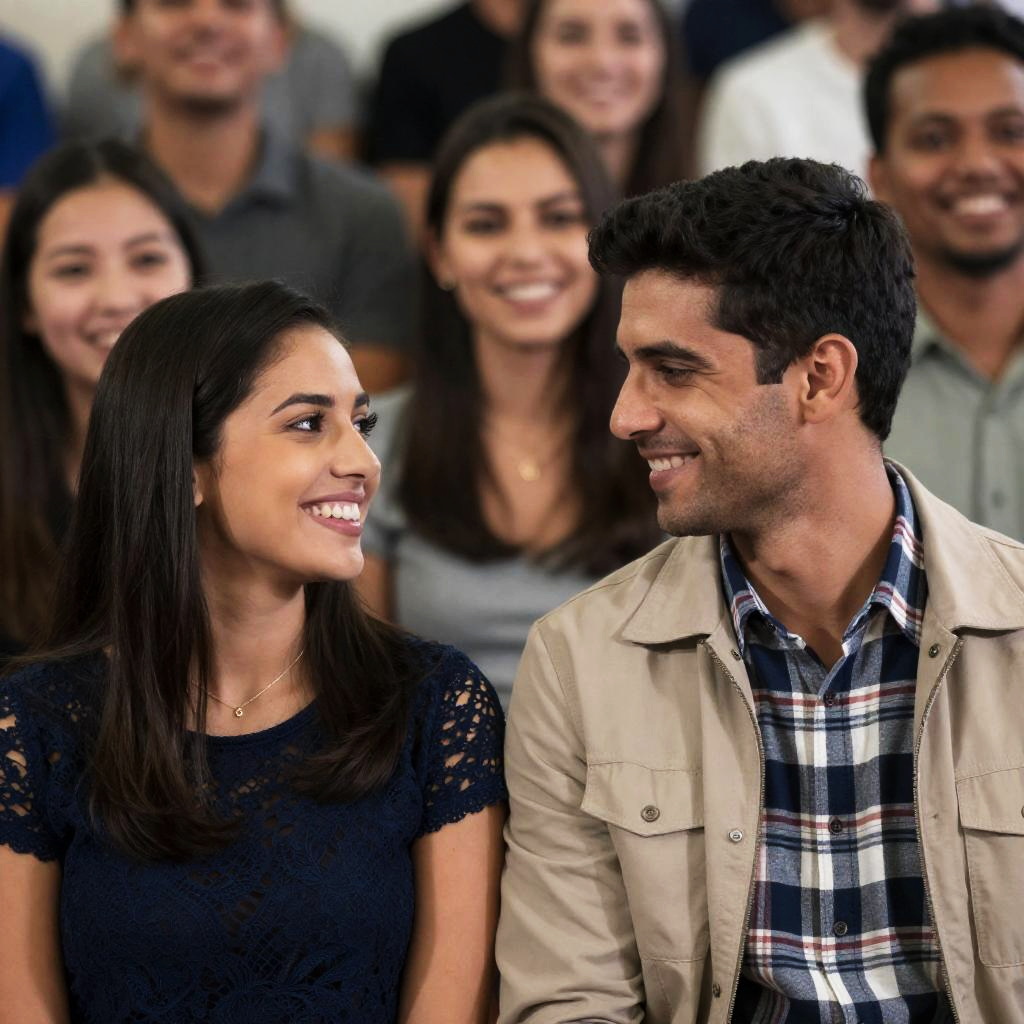 Photograph of a couple standing close together in front of a photo display. Woman with long brown hair, black dress, and necklace leans against man with short dark hair, light gray shirt, and slight beard. Both smiling. Photo display has multiple photos of different people. Warm indoor lighting, blurred background with another person.