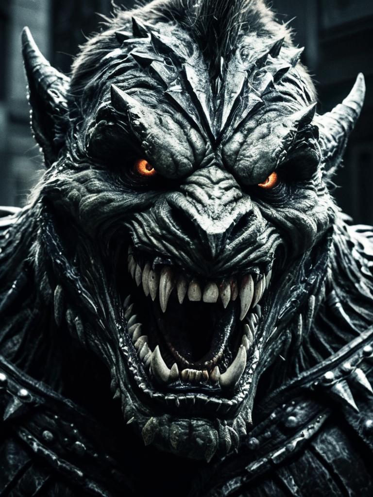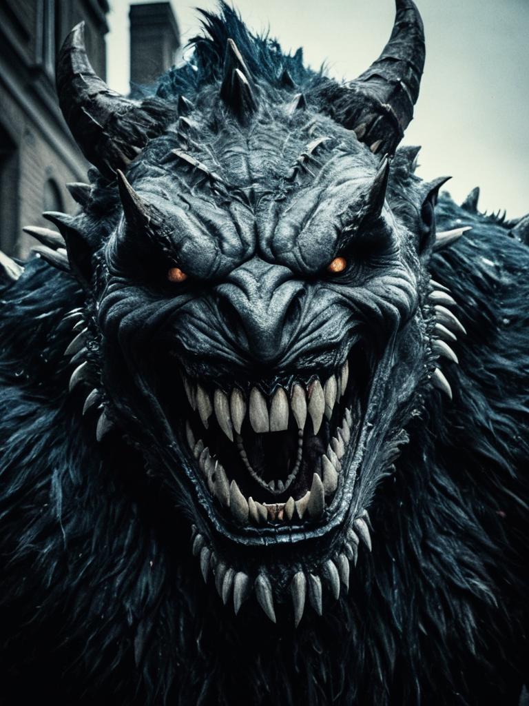 Man in Beast Teeth Costume, cinematic realism, monstrous detailed portrait