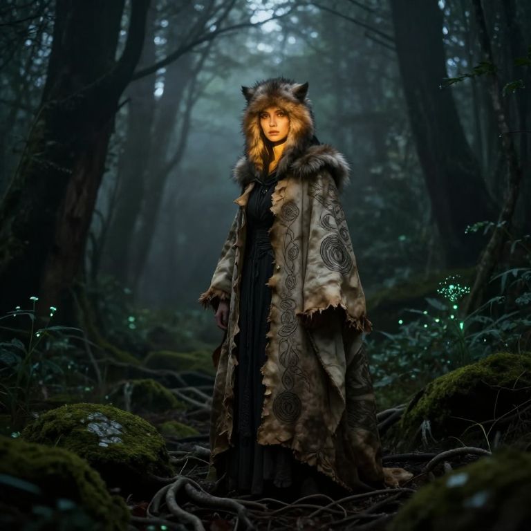 Mist-shrouded market streets hum with activity as hooded figures, including a central woman in a teal cloak adorned with golden embroidery and leather gloves, navigate the dimly lit stalls where vendors display wares under warm, flickering lights.