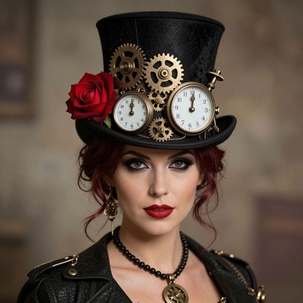 A steampunk-inspired digital artwork featuring a woman adorned with a black top hat embellished with intricate gears, clocks, and a vibrant red rose, set against a softly blurred vintage-style background, evoking a blend of retro and frontier punk aesthetics.