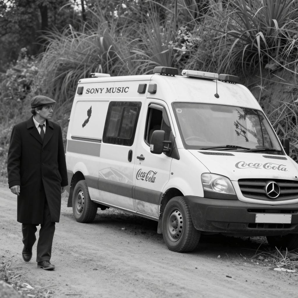 Black and white photograph of a heavily damaged ambulance on a dirt road, leaning to the right with its front and rear wheels off the ground. A man in a long coat and flat cap walks to the left, looking away from the ambulance. "SONY MUSIC" and "COCA-COLA" s are on the ambulance. Grass and dirt fill the background.