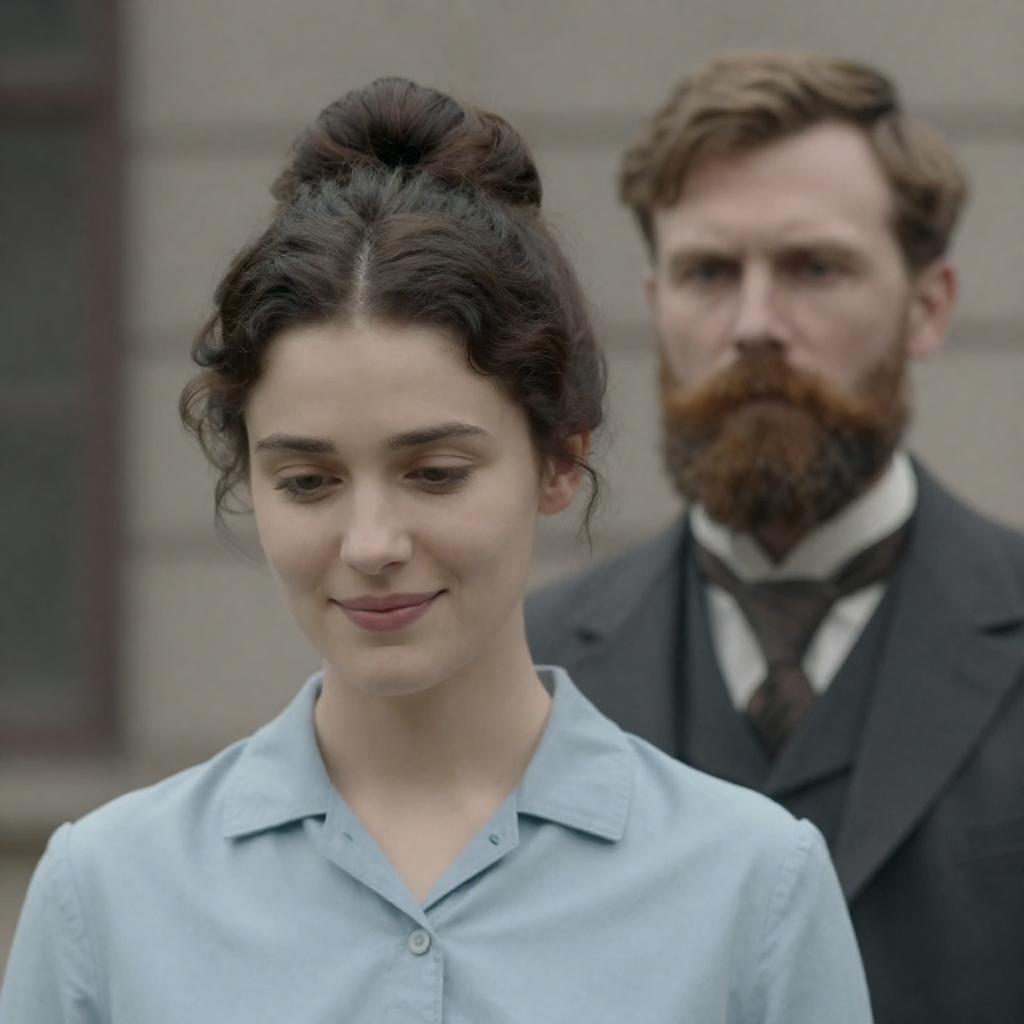 Historical film scene: young woman with long brown hair, brown dress, intense expression, stands in foreground. Man in gray coat, black gloves, beard, serious expression, walks behind her. Stone building, blurred people in background, hats, early 19th century attire.
