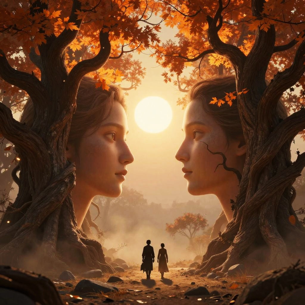 This digital artwork features two massive, twisted trees with fiery orange leaves framing two large, detailed human faces on each trunk. The sun is shining brightly behind them, creating a glowing halo effect. In the background, two small, silhouetted figures walk towards each other on a dusty, rocky path. The scene has a surreal, fantasy-like atmosphere.