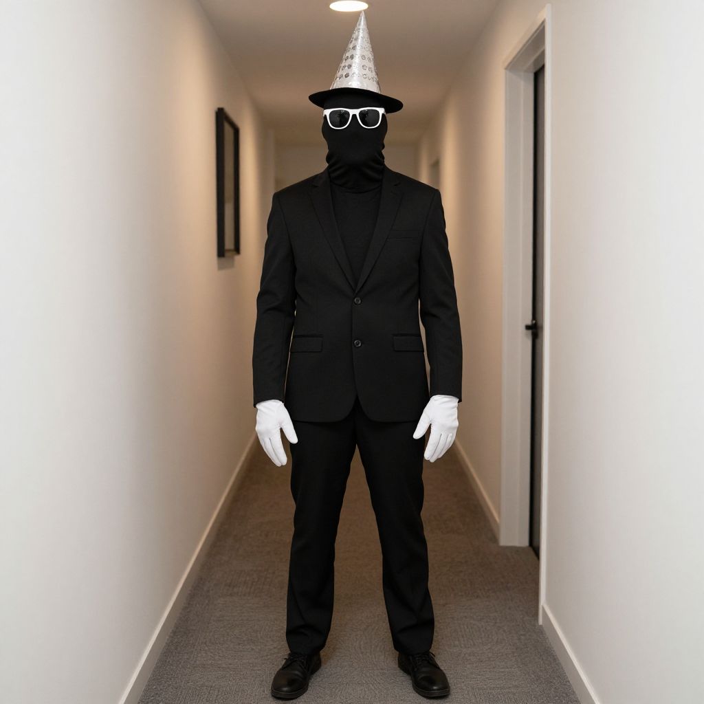 Photograph of a mysterious figure in a black suit, white gloves, black sunglasses, and a white cone hat, standing in a white, narrow hallway