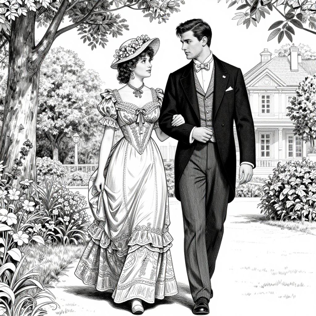 Black-and-white drawing of a Victorian couple walking hand-in-hand through a garden, wearing elaborate dresses and suits, with a house in the background.