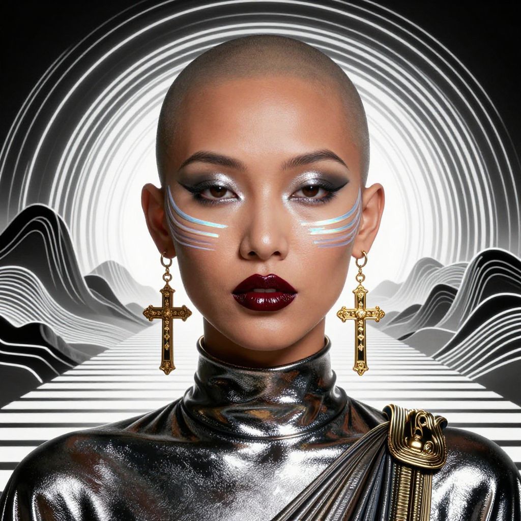 A highly stylized digitally drawn hyper-realistic artwork featuring a striking bald Nepalese woman with pale light brown skin against a surreal minimalist background, The close-up emphasizes her smooth, flawless complexion, adorned with iridescent striped face markings stretching elegantly across her cheeks, adding a unique artistic flair, Her piercing gaze is accentuated by shimmering metallic eyeshadow, while glossy deep red lips provide a bold, dramatic contrast, She wears metallic urban Buddhist monk attire featuring a sleek turtleneck, its reflective surfaces amplifying the interplay of light and accentuating her avant-garde presence, Large, intricately detailed golden earrings shaped like Christian Holy Crosses glint in the light, adding modern sophistication, The background incorporates black-and-white linear optical illusions, forming ascending pathways, abstract mountainous shapes, and concentric geometric arcs, seamlessly blending natural and surreal elements, A glowing aura surrounds her, created from black-and-white concentric lines radiating outward in rhythmic harmony, symbolizing energy and strength, The intricate background enhances the visual depth while maintaining a focus on her avant-garde style, This masterpiece embodies sleek elegance, ultra-detail, and captivating surrealism in HD